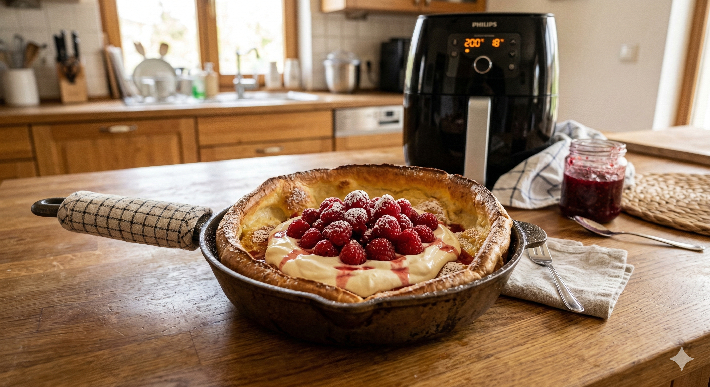 Lekki, puszysty Dutch baby z soczystymi malinami — idealny pomysł na szybkie, efektowne śniadanie lub deser. Przygotowany w airfryerze zyskuje chrupiące brzegi i miękki, napuszony środek, a ulubione owoce dodają świeżości i koloru. Prosty przepis, który zachwyci gości i rodzinę — podawaj z cukrem pudrem, syropem klonowym lub gałką lodów waniliowych. Idealny na leniwe poranki i szybkie spotkania przy kawie.