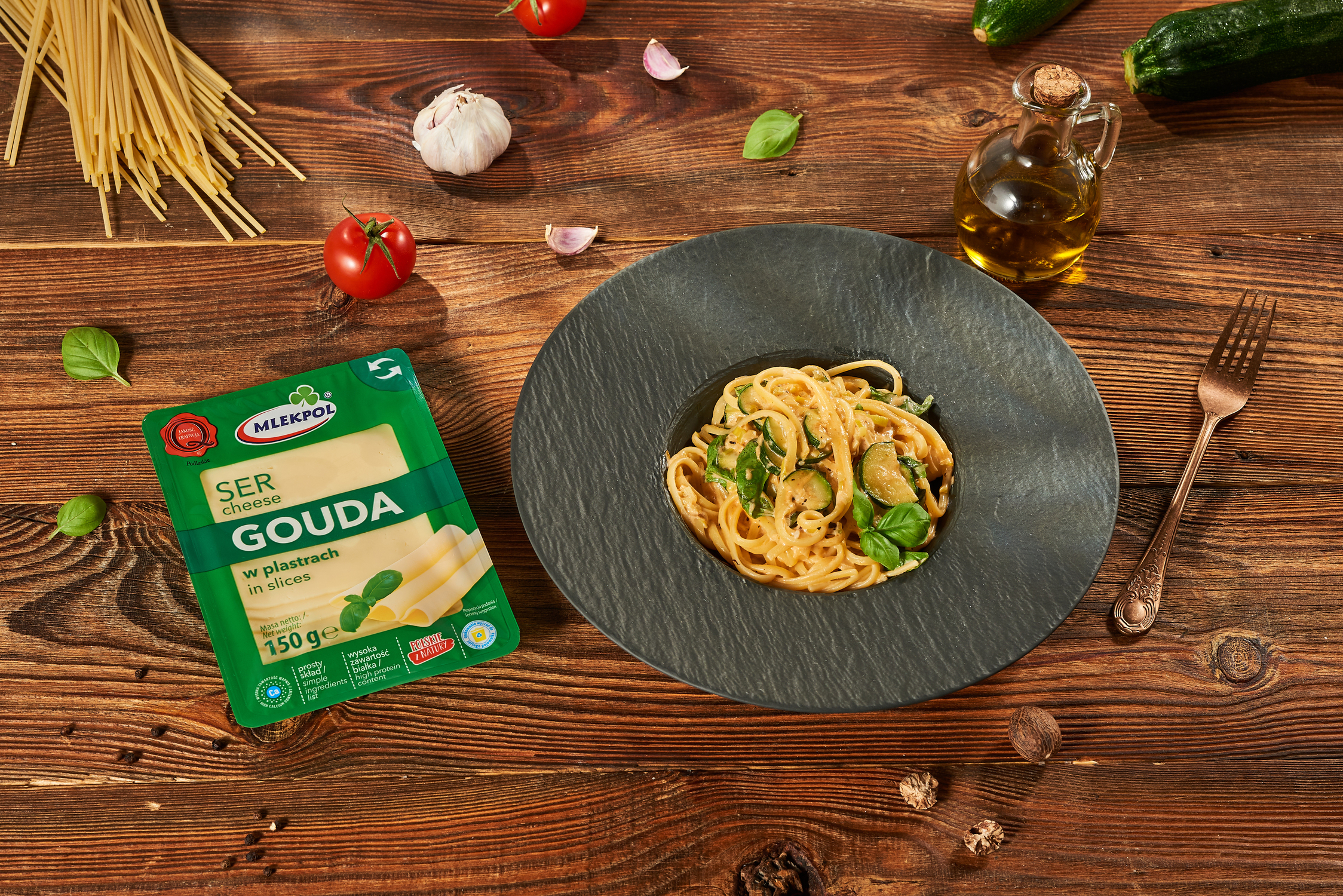 Masło klarowane podgrzewamy na patelni. Dodajemy por, przyprawiamy suszonymi pomidorami z czosnkiem i bazylią. Dodajemy cukinię.