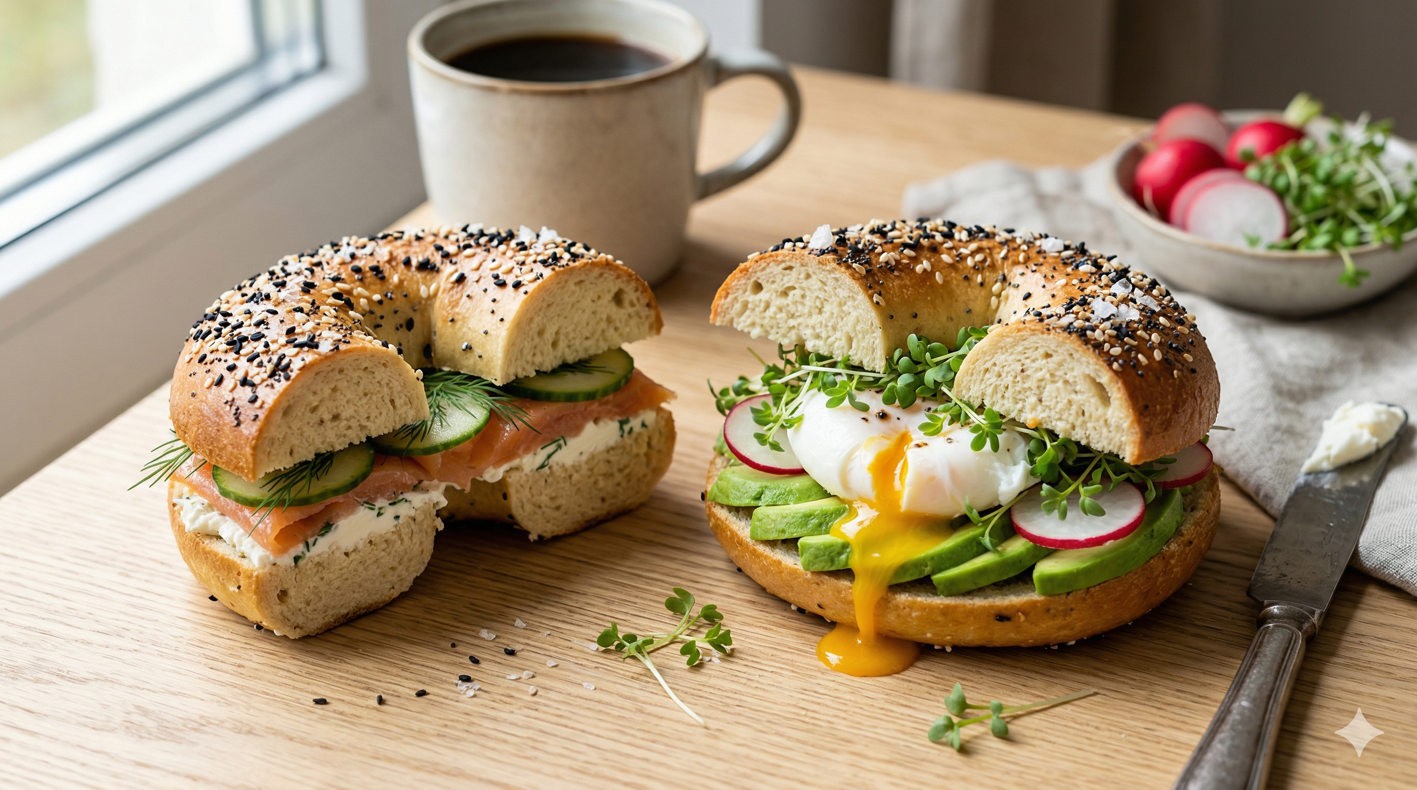 Klasyczny bajgel to głównie mąka. Tutaj baza to twaróg, co sprawia, że śniadanie ma niski ładunek glikemiczny i trzyma sytość na długo.
