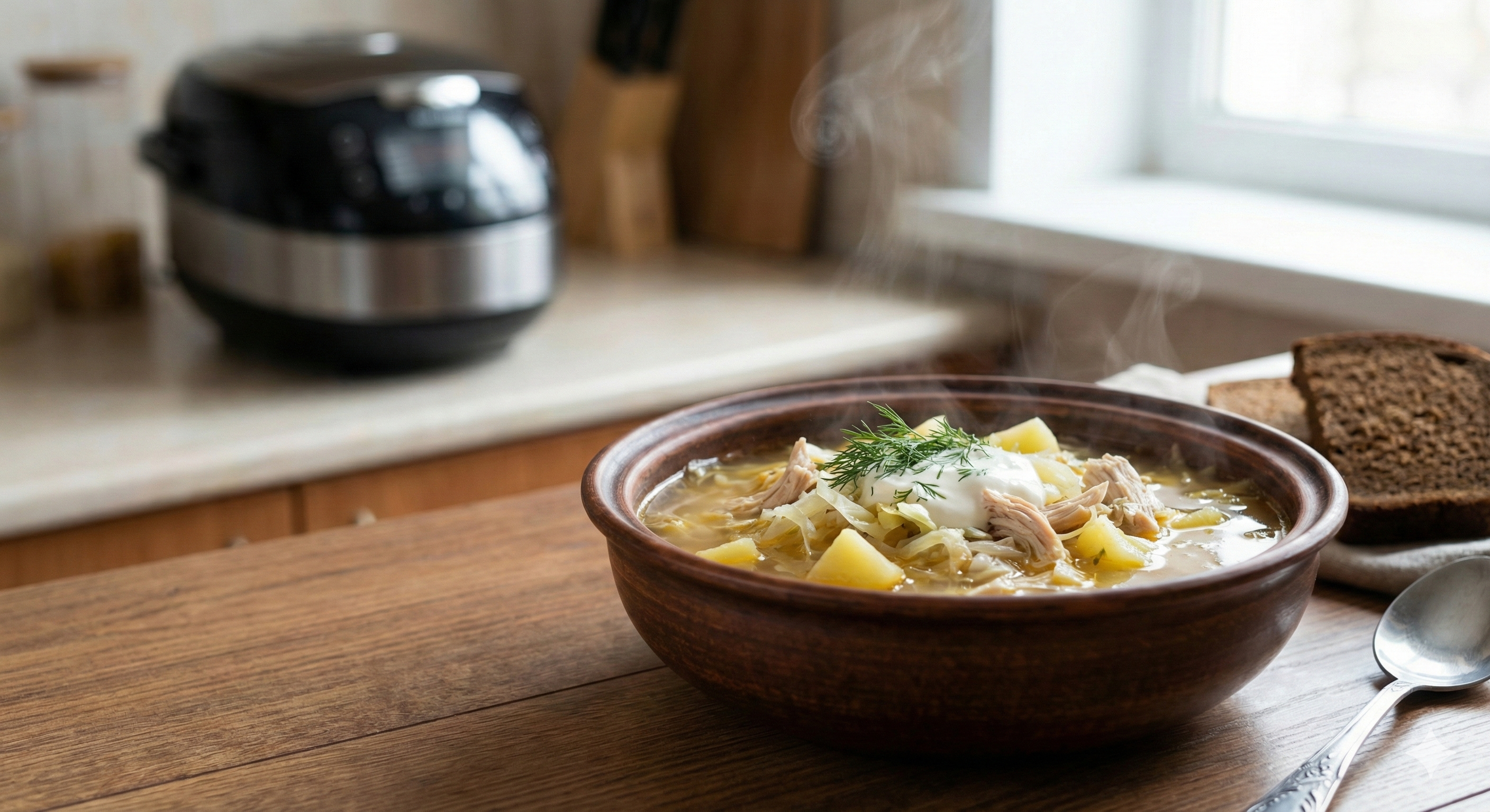 Włóż wszystkie składniki do misy multicookera, zalej wodą, dodaj przyprawy i wymieszaj. Zamknij pokrywę, ustaw program ZUPA/BULION na 1 godzinę i wciśnij przycisk START. Gotuj do zakończenia programu. Podawaj z kleksem śmietany i koperkiem.