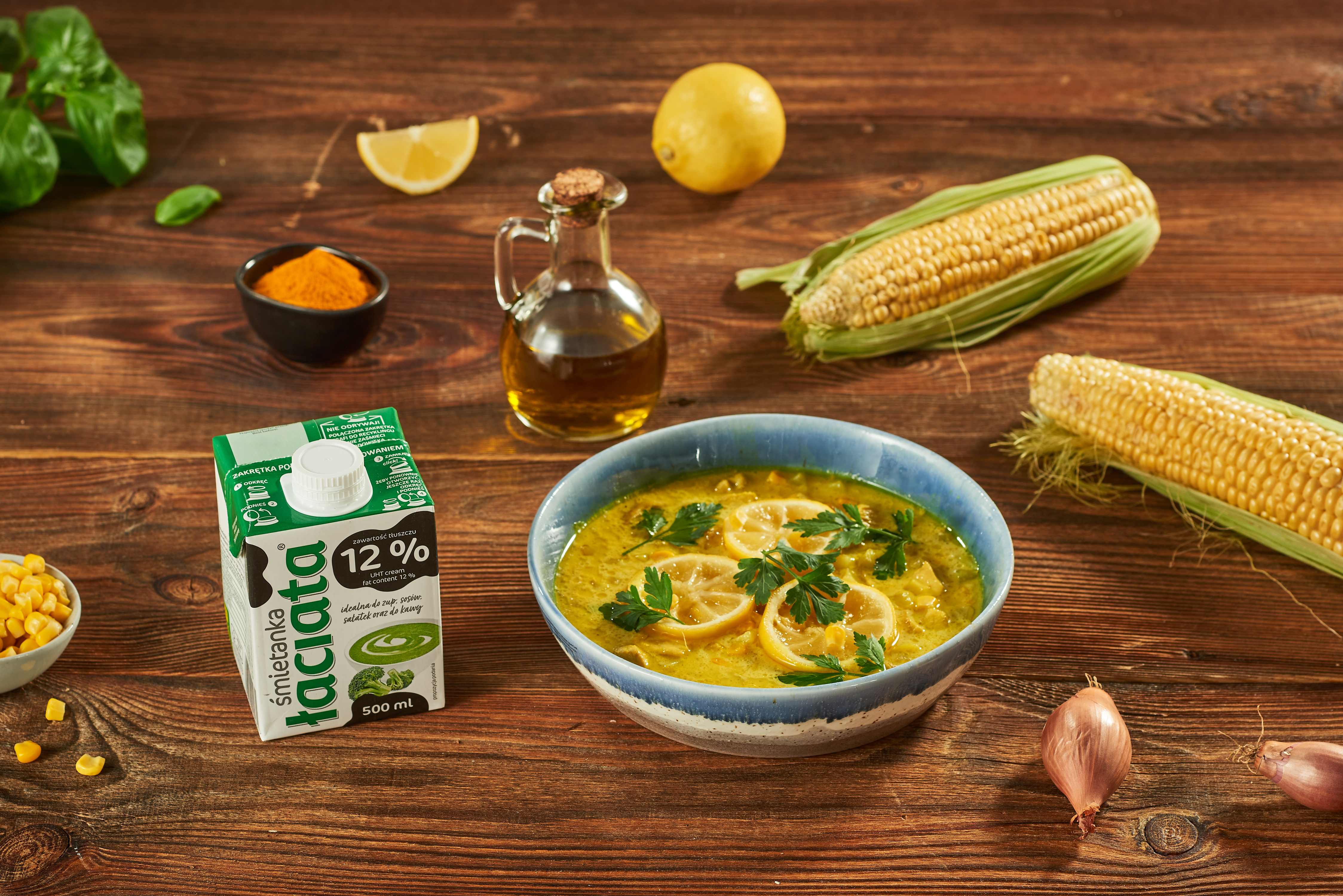 Kiedy ziemniaki zaczną mięknąć dodajemy kukurydzę i całość zalewamy bulionem. Gotujemy kilka minut.