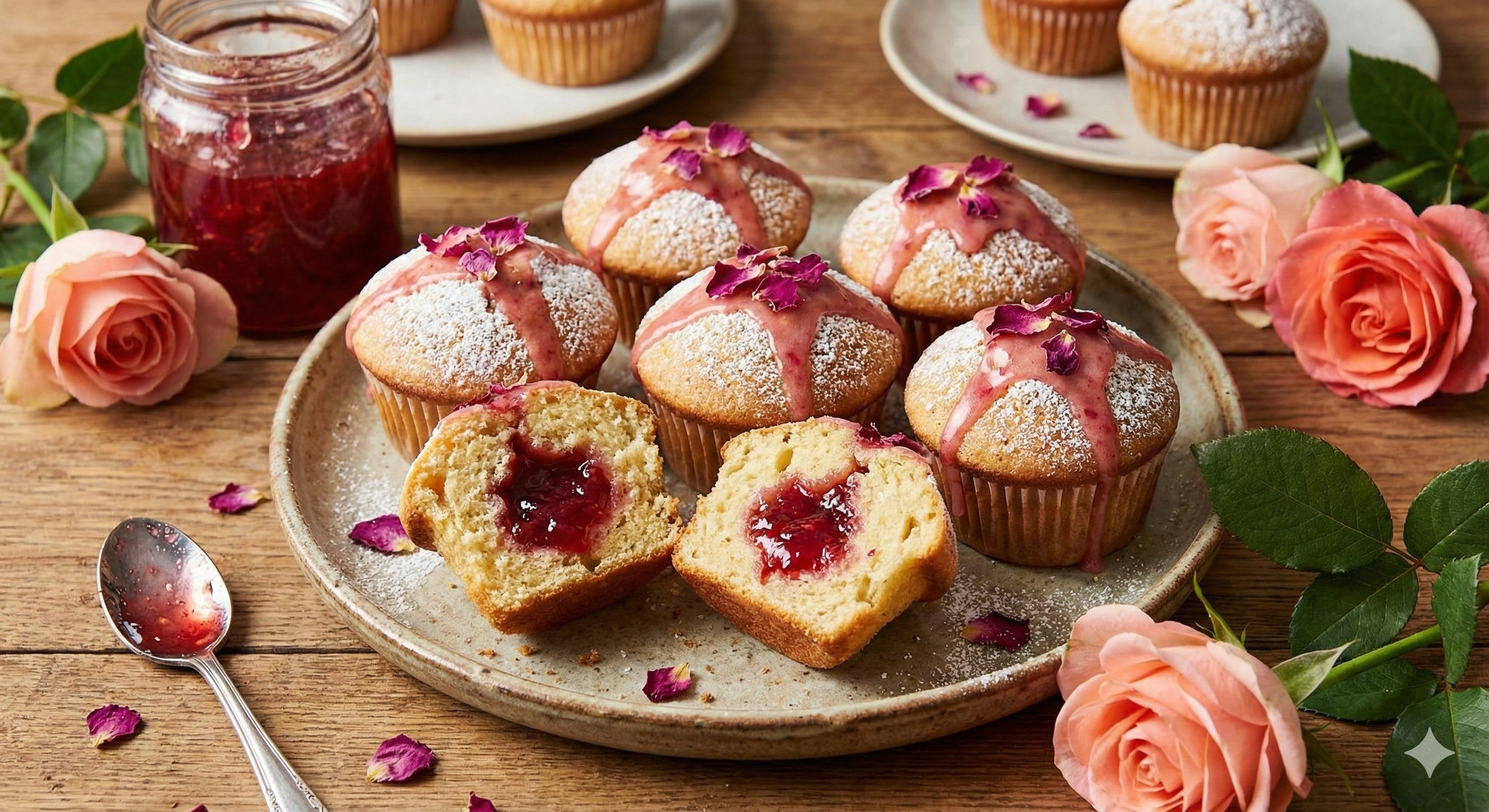 Marmoladę wymieszać z konfiturą z płatków róży. Do formy muffinowej włożyć 12 papilotek, wyłożyć połowę wyrośniętego ciasta i ułożyć porcję marmolady.
