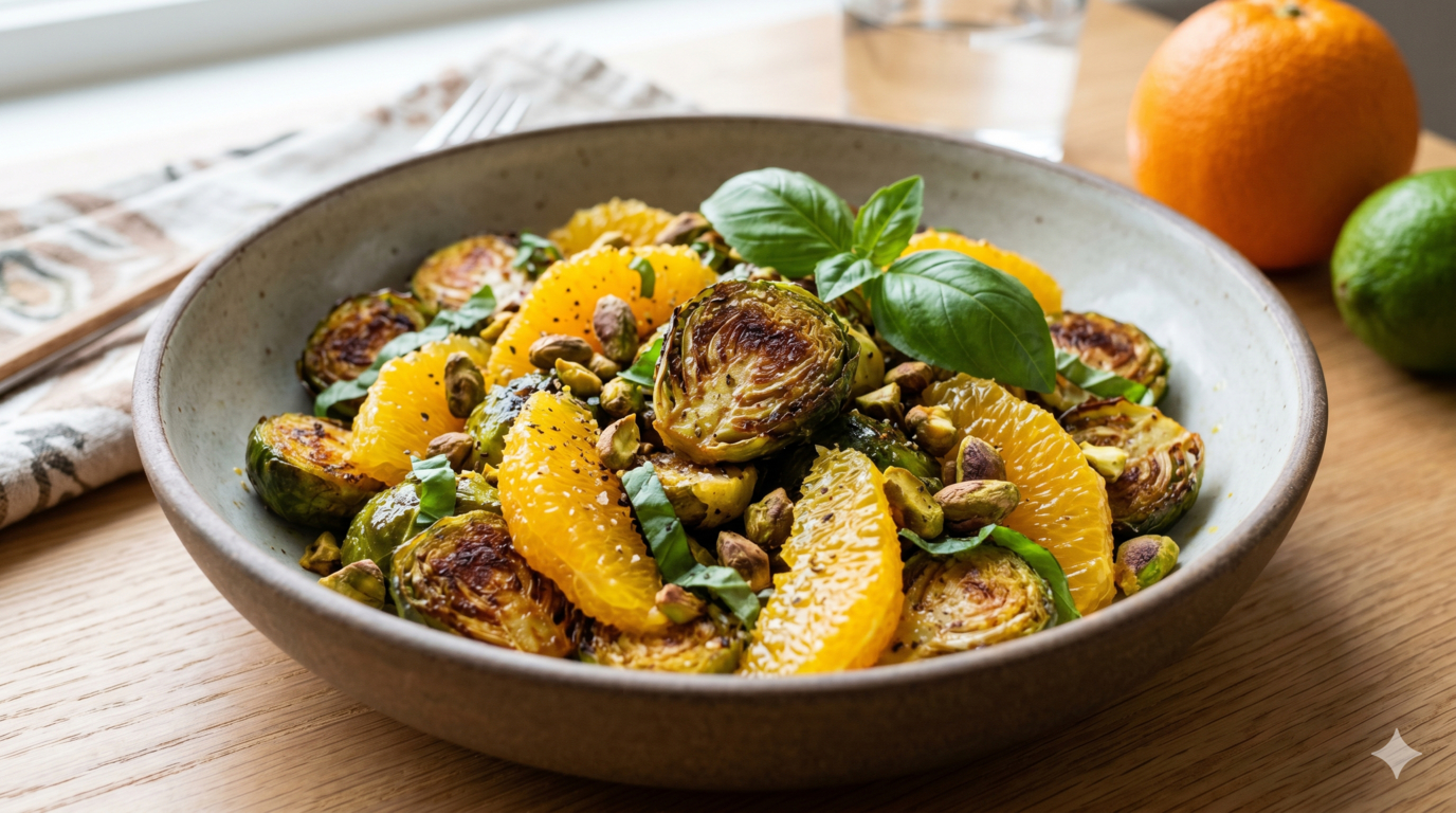 Do miski z dressingiem i pomarańczami dodaj gorącą, upieczoną brukselkę, grubo posiekane pistacje oraz porwane liście bazylii. Wymieszaj wszystko delikatnie, ale energicznie, i podawaj natychmiast.