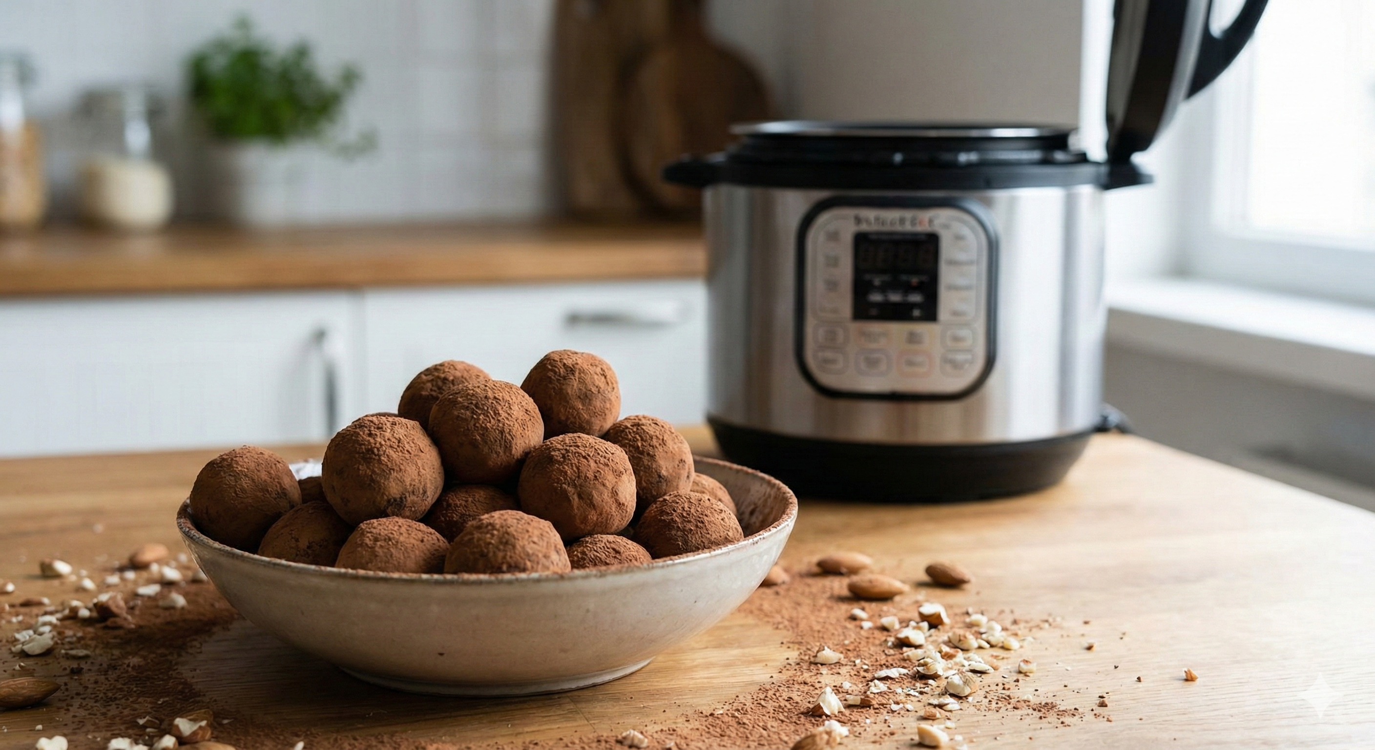 Gotową mieszankę ostudź i wstaw do lodówki na 1 godzinę, następnie uformuj z niej kulki, do każdej włóż migdał i obtocz w kakao.