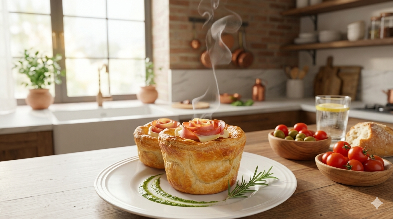 Przygotowanie "różyczek". Na desce ułóż plaster sera, a na nim plaster szynki (możesz je lekko przesunąć względem siebie). Zwiń plasterki w ciasny rulon, tworząc kształt przypominający pąk róży. Włóż przygotowane różyczki z szynki i sera do upieczonych wcześniej koszyczków z ciasta francuskiego.