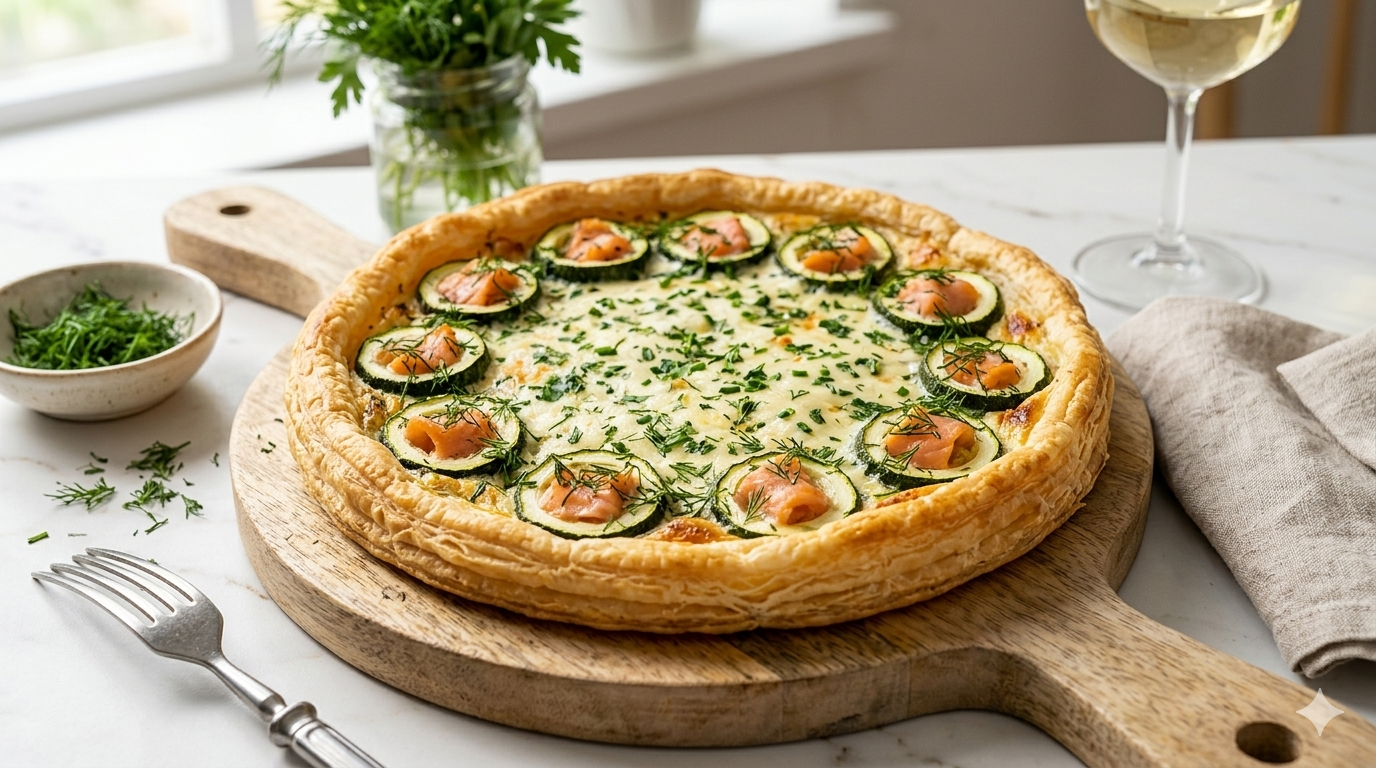 Ta tarta z cukinią i łososiem to świetny pomysł na szybką, a zarazem efektowną przekąskę. Tarta smakuje obłędnie zarówno na ciepło, jak i na zimno. Idealna na domówkę! Smacznego!