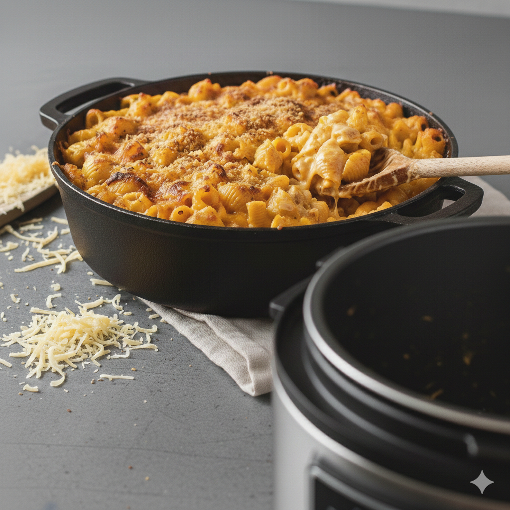 Przez 4 minuty gotuj makaron pod ciśnieniem w milticookerze. Następnie dodaj tarty ser, masło oraz resztę śmietanki.