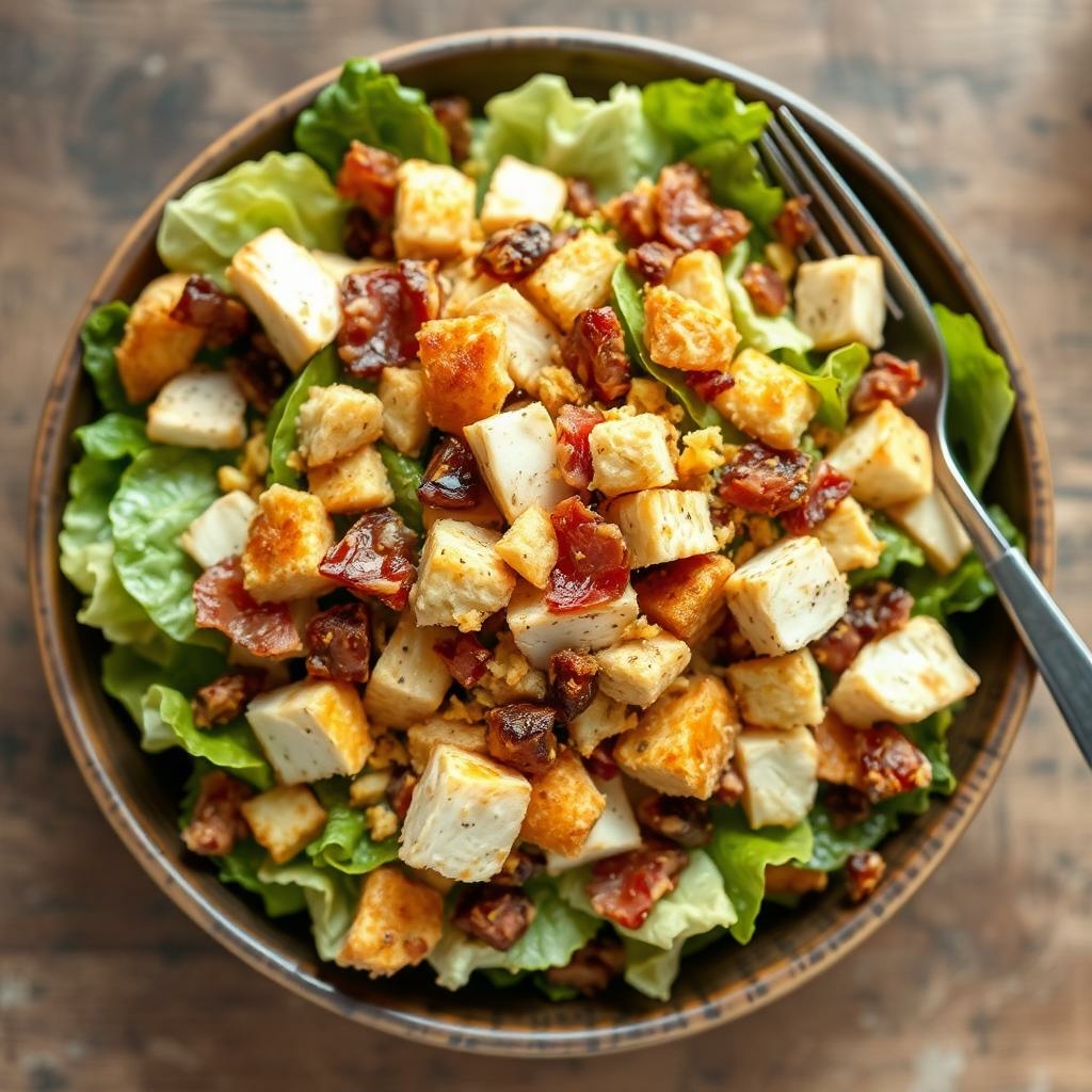Na koniec dodaj do sałatki jeszcze pomidory pokrojone w plastry lub drobniej. Kawałki kurczaka posyp prażoną cebulką, zaś całość szczypiorkiem i ewentualnie świeżo mielonym pieprzem. Dodaj domowe grzanki i pokrojony w kawałki ser żółty. Podawaj od razu po zrobieniu.
